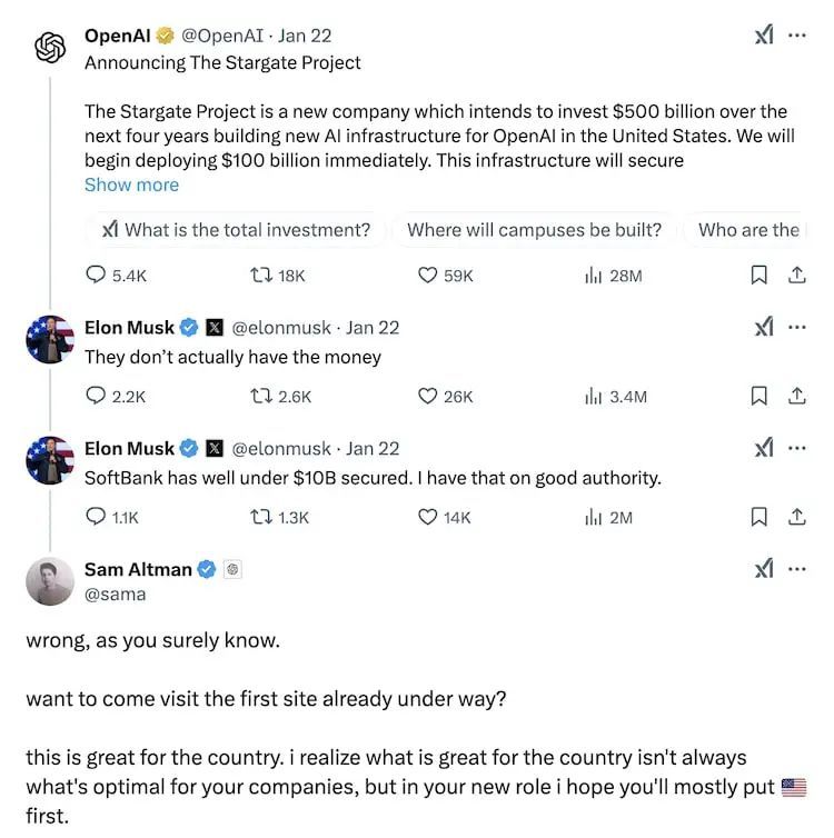 但是,“星际之门”(Stargate)项目刚宣布的第二天,埃隆·马斯克就在X.com上公开拆台: